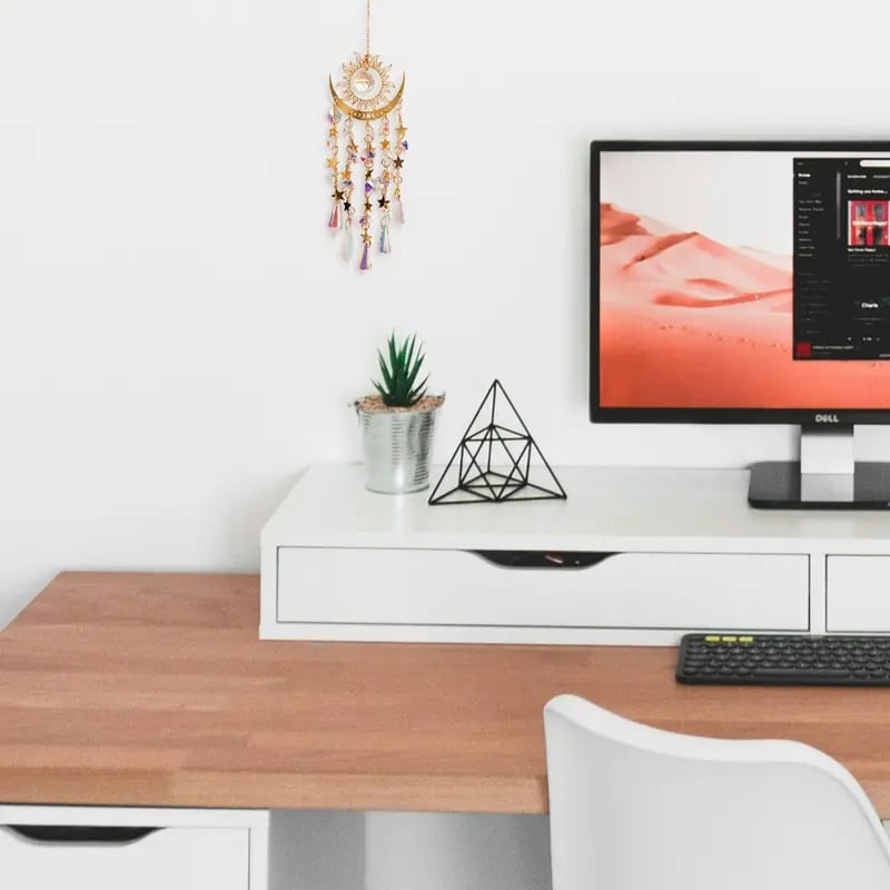 🌈RainbowMaker: El Atrapasol tiene un marco de metal brillante con motivos de sol, luna y estrellas. Los cristales artificiales y los colgantes captan la luz del sol, creando un efecto de luz y sombra de ensueño. Su diseño único, su fina artesanía y su gran capacidad decorativa lo convierten en una pieza de arte cautivadora.