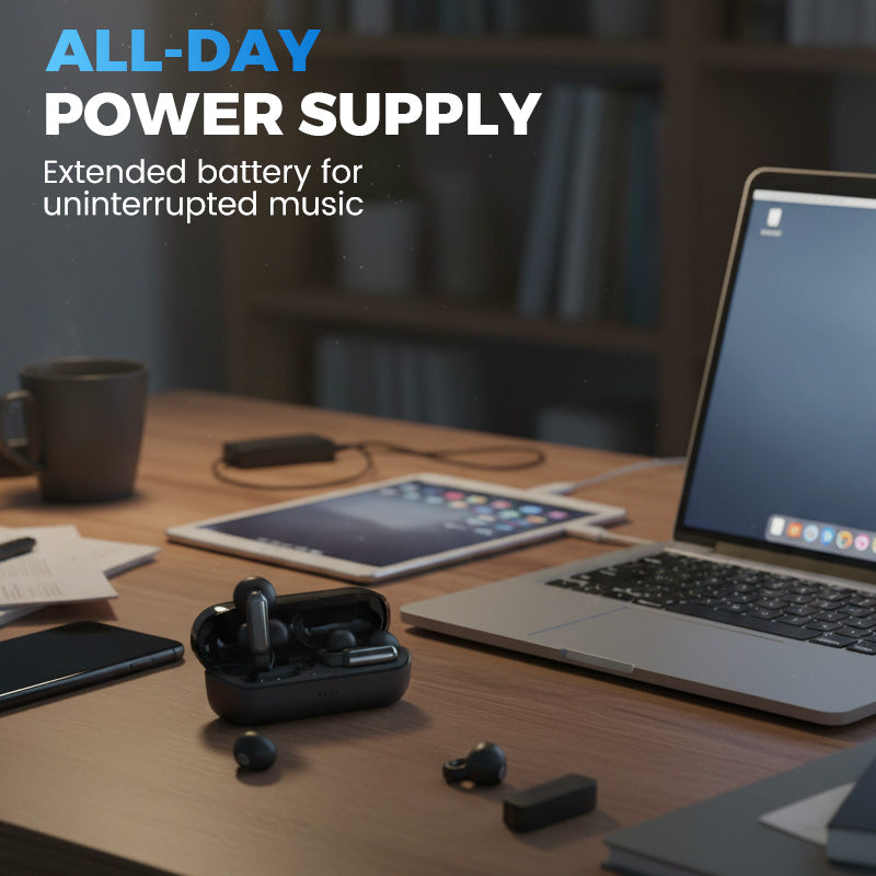 MAYOR DURACIÓN DE LA BATERÍA - Gracias a un eficiente sistema de gestión de la energía, disfruta de horas de música ininterrumpida. El estuche de carga portátil proporciona una importante reserva de energía, lo que garantiza que tus auriculares estén siempre listos para tus desplazamientos diarios, tus entrenamientos o tus viajes.
